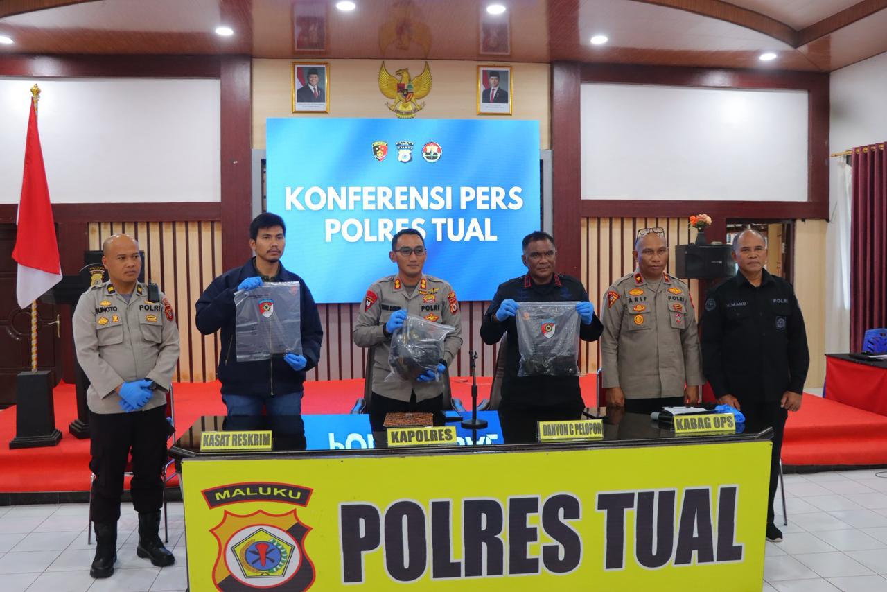 Kapolres Tual, Whansi Des Asmoro, menjelaskan bahwa sejumlah barang bukti telah diamankan untuk mendukung proses penyidikan. Barang bukti tersebut antara lain helm taktis milik tersangka, dua unit sepeda motor, kunci milik korban, serta perlengkapan lain yang ditemukan saat kejadian.